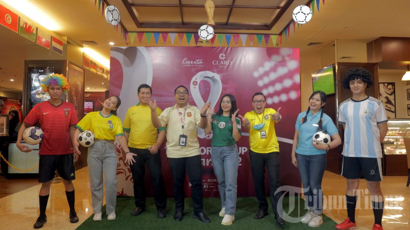 Karyawan hotel menggunakan atribut peserta piala dunia saat konferensi pers yang berlangsung di Carita Lounge. Claro Makassar, Jl AP Pettarani, Rabu (16/11/2022). Hotel di bawah naungan Manajemen Phinisi Hospitality Indonesia (PHI) yaitu Claro Makassar, The Rinra dan Dalton memberikan paket nonton bareng (nobar) Piala Dunia 2022.