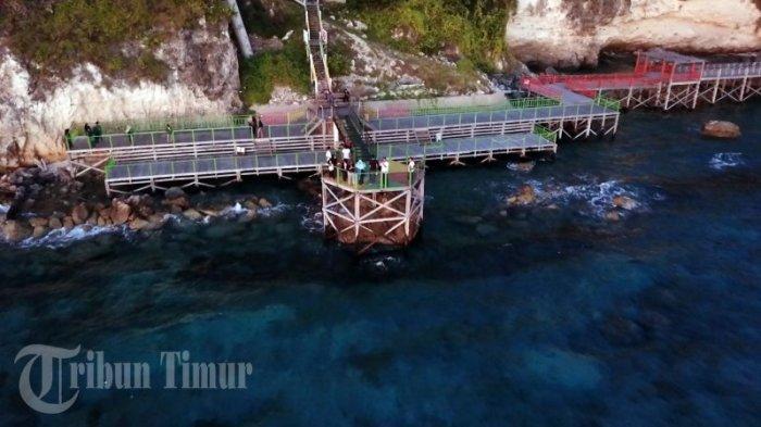 TRIBUNTIMUR.COM, BULUKUMBA - Destinasi Jembatan Kaca Bira Timur di Titik Nol Sulsel terekam menggunakan kamera drone Tribun Timur di Kecamatan Bonto Bahari, Kabupaten Bulukumba, Sulsel, Selasa (22/11/2022).