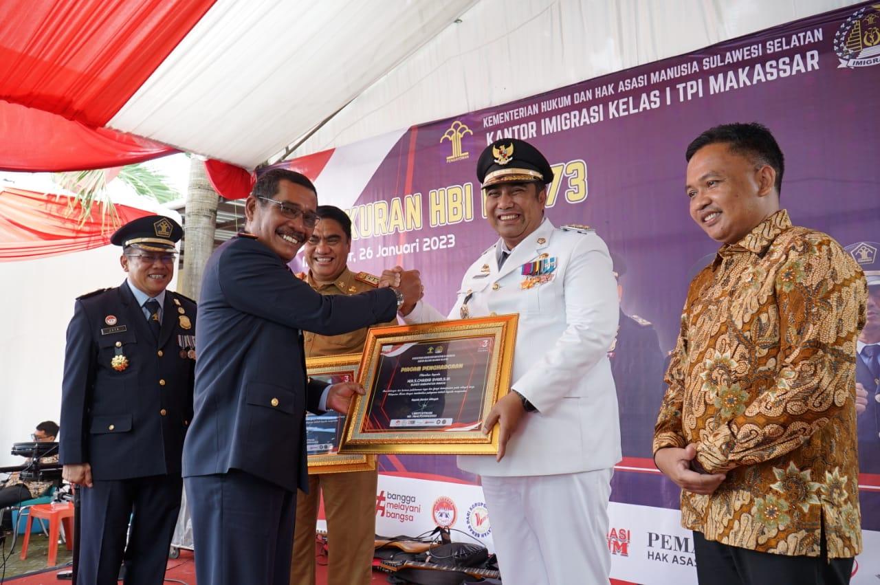 Kakanwil Sulsel menyerahkan piagam penghargaan ini didampingi Kadiv Keimigrasian Jaya Saputra dan Kakanim Makassar Agus Winarto sebagai penanggung jawab teknis di sela rangkaian acara peringatan HBI ke-73 tingkat wilayah yang dilaksanakan di Kantor Makassar, Kamis (26/01).