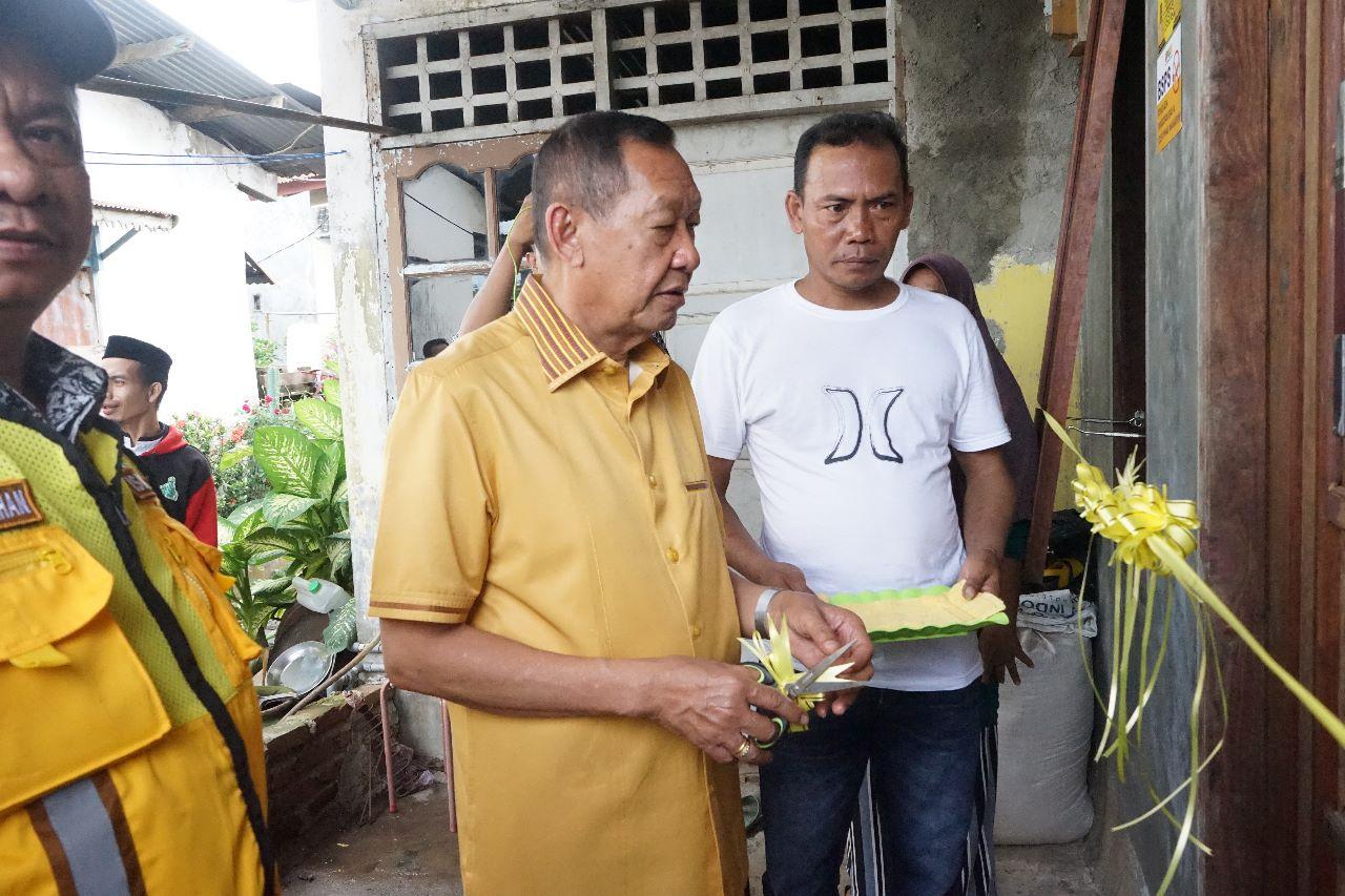 Peresmian bantuan bedah rumah ditandai dengan pengguntingan pita berwarna kuning oleh politisi senior Partai Golkar tersebut.