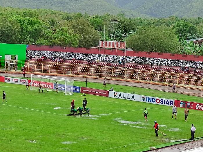 Namun, jelang kick off sejumlah titik di lapangan Stadion BJ Habibie tergenang air.