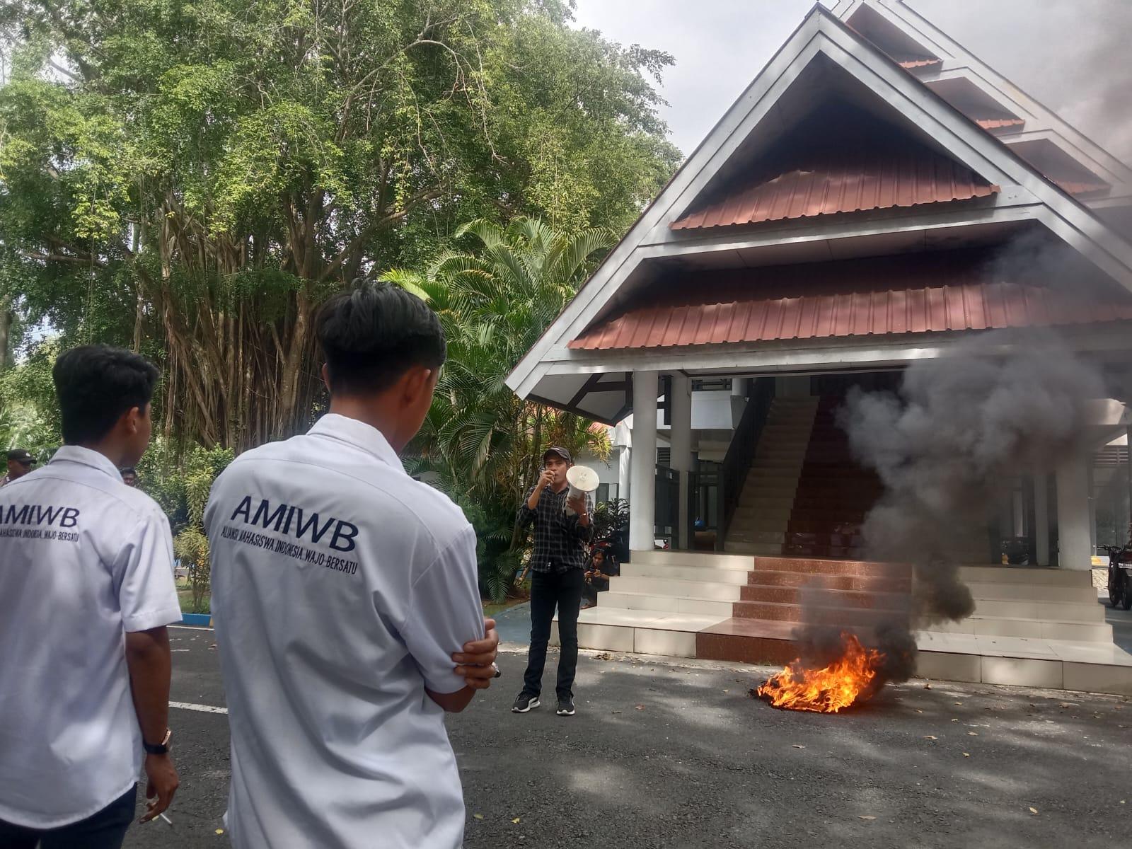 TRIBUNWAJO.COM, SENGKANG - Aliansi Mahasiswa Indonesia Wajo Bersatu (AMIWB) gelar unjuk rasa di depan kantor DPRD Kabupaten Wajo, Rabu (8/3/23).