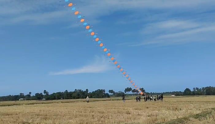 Layangan raksasa. Panjangnya 115 meter. Ikatan pengendalinya memakai tali tambang dan ditarik oleh belasan orang.