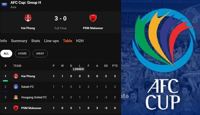 Berdasarkan hasil dan klasemen AFC Cup Grup H 2023/2024, Hai Phong FC dan Sabah FC kompak menang sedangkan PSM Makassar berstatus juru kunci.