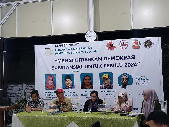 Acara berbalut Coffe Night alumni sekolah demokrasi sulsel menghadirkan empat pembicara level Sulawesi Selatan.