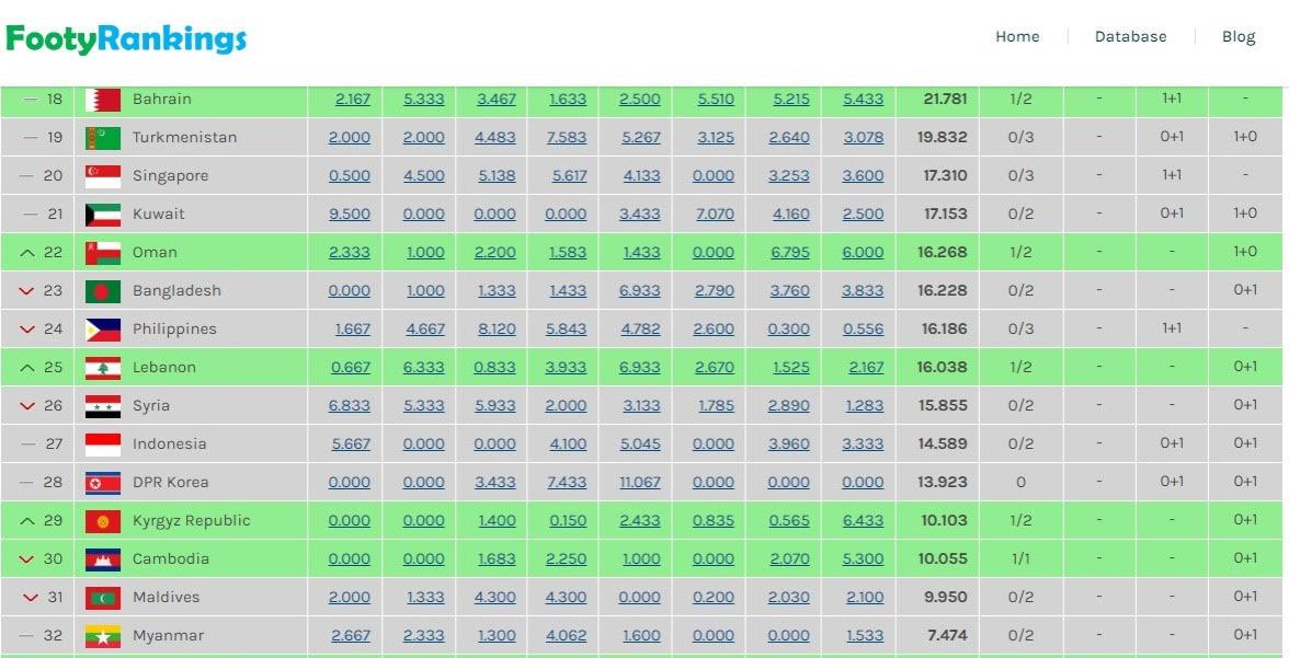 Pantauan dari weebsite footy rankings menunjukkan Indonesia berada di peringkat 27 Asia dan peringkat 11 di Asia wilayah timur dengan total poin 14.589.
