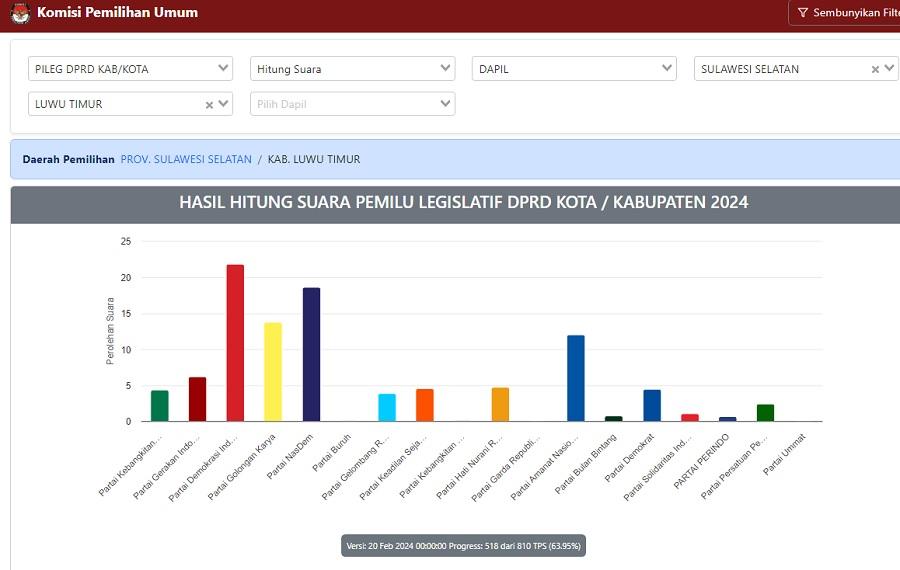 Perolehan suara Partai Pileg DPRD Lutim berdasarkan real count KPU, Selasa (20/2/2024) Pukul 01.50 Wita