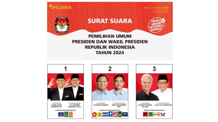 Disusul pasangan Prabowo-Gibran 594 suara dan pasangan Anies-Muhaimin 382 suara.