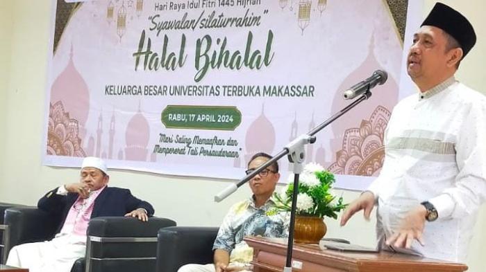 Direktur UT Makassar Prof Dr H Abdul Rahman Rahim, SE MM saat memberi sambutan pada acara Halal bi Halal dan Silaturrahim Idul Fitri 1445 H civitas akademika kampus di Kantor UT Makassar, Rabu (17/4/2024).