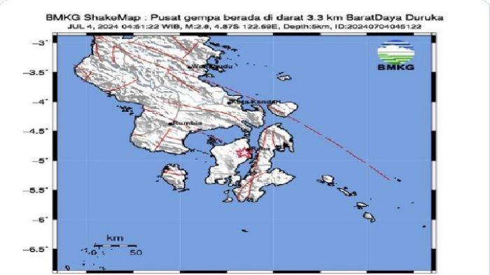 TRIBUN-TIMUR.COM - Terkini gempa bumi dengan magnitudo 2,8 guncang wilayah Duruka, Sulawesi Tenggara (Sultra), Kamis (4/7/2024) pada pukul 04:51 WIB.