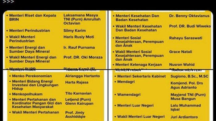 Berikut nama-nama yang masuk dalam Kabinet Prabowo-Gibran Periode 2024-2029 versi unggahan tersebut.