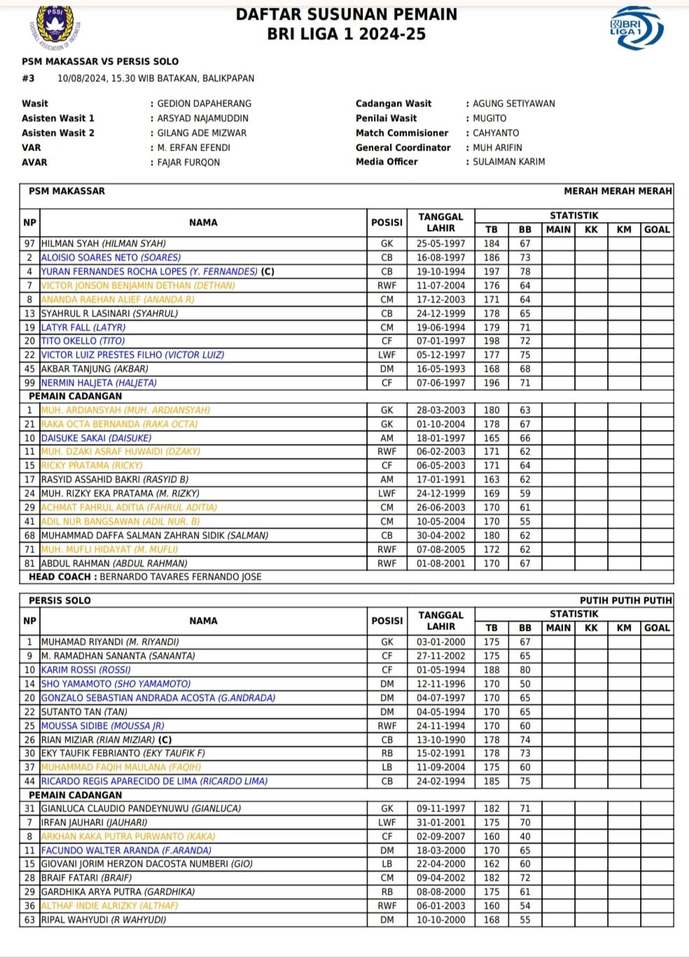 BREAKING NEWS: Susunan Pemain PSM Makassar vs Persis Solo, 6 Pemain Asing Daisuke Cadangan