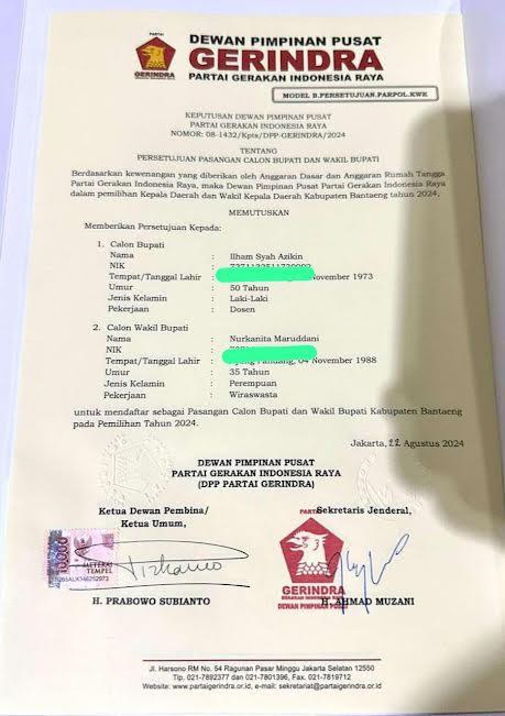 TRIBUN-TIMUR.COM – Partai Gerindra secara resmi memberikan dukungan kepada pasangan calon Ilham Syah Azikin dan Nurkanita Maruddani untuk Pilkada Bantaeng 2024.