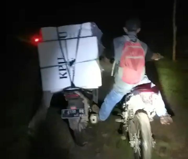 Walau melewati jalan ekstrem dan dalam keadaan gelap gulita, KPPS itu terlihat sigap memegang kotak suara agar tak jatuh.