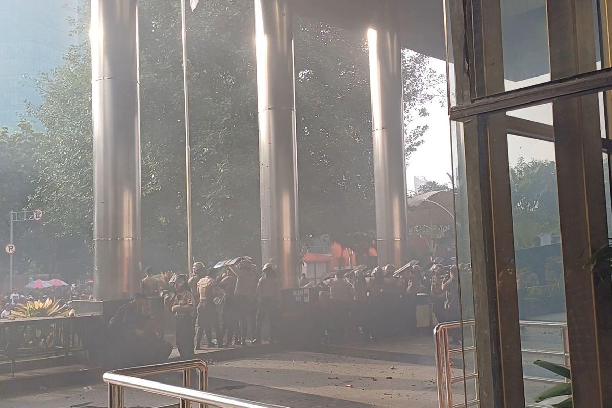 Seketika bagian depan Gedung Merah Putih KPK diselimuti asap tebal.