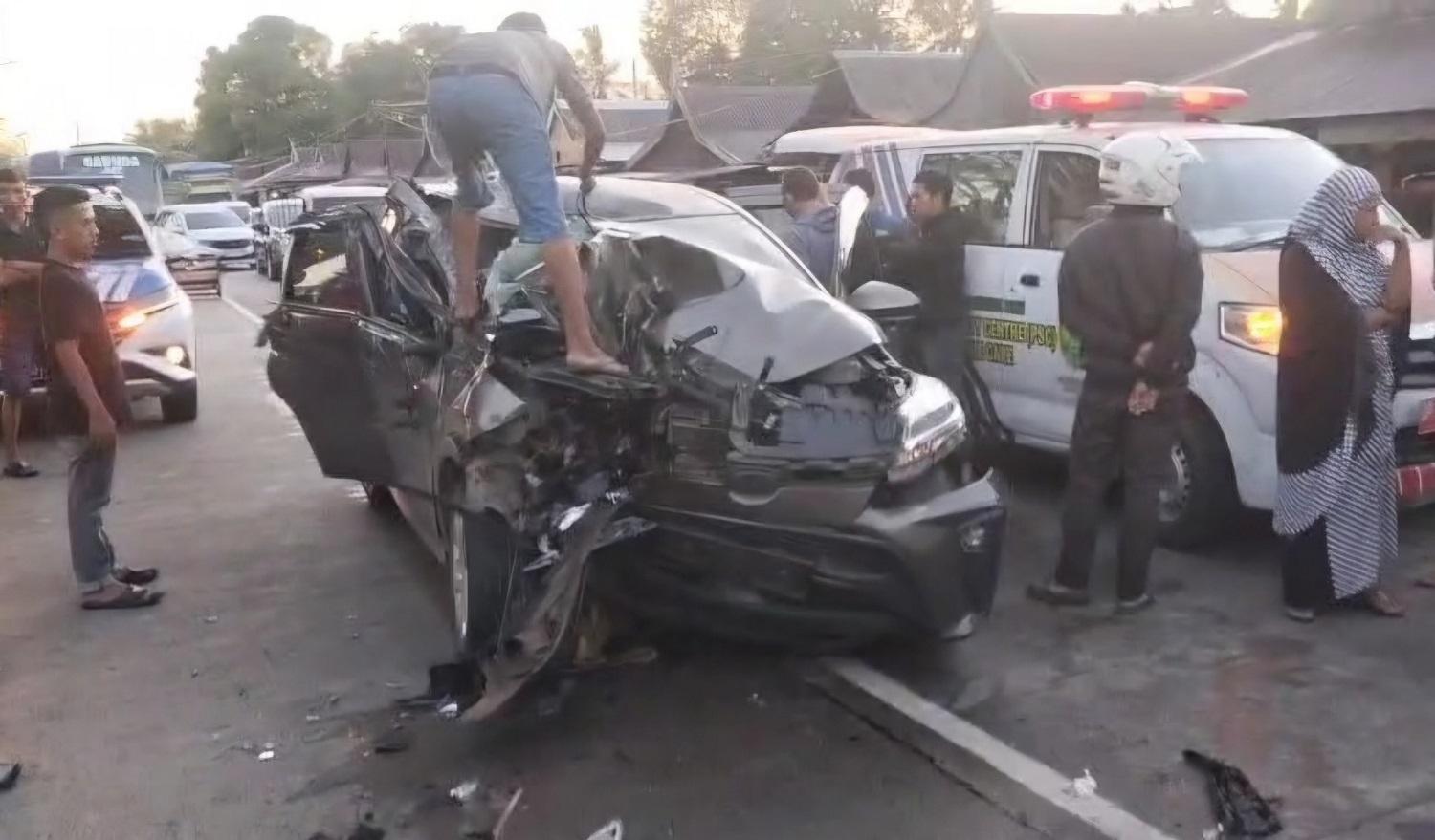 "Selain itu, kap atap depan sebelah kanan ringsek, tulang bodi pintu depan sebelah kanan ringsek, tulang bodi kap atap depan sebelah kanan ringsek, pintu depan sebelah kanan peot, lampu dan weser depan sebelah kanan hancur, radiator pecah, tulang bodi mesin bengkok, dan airbag terbuka," paparnya.