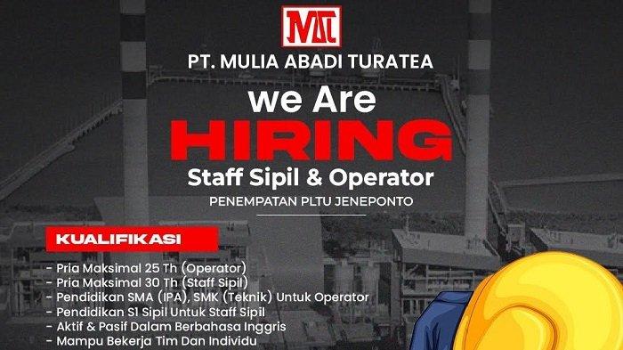 Berikut informasi kualifikasi lowongan kerja PT Mulia Abadi Turatea penempatan PLTU Jeneponto: