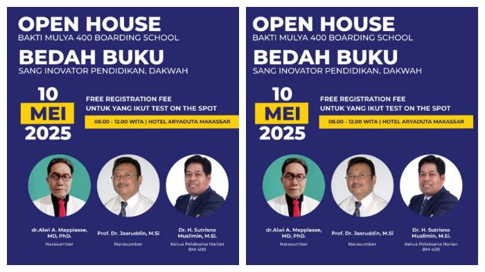 TRIBUN-TIMUR.COM - Manajemen Bakti Mulya 400 Boarding School Jakarta akan menggelar Open House di Hotel Aryaduta Makassar, Sulawesi Selatan, pada Sabtu, 10 Mei 2025.