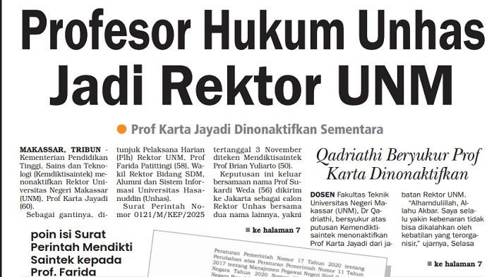TRIBUN-TIMUR.COM - Kementerian Pendidikan Tinggi, Sains dan Teknologi (Kemdiktisaintek) menonaktifkan Rektor Universitas Negeri Makassar (UNM), Prof Karta Jayadi (60).