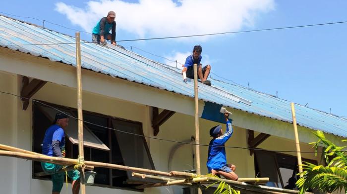 Sejumlah tukang tampak sibuk mengecat dinding gedung dan memperbaiki bagian atap yang mulai lapuk.