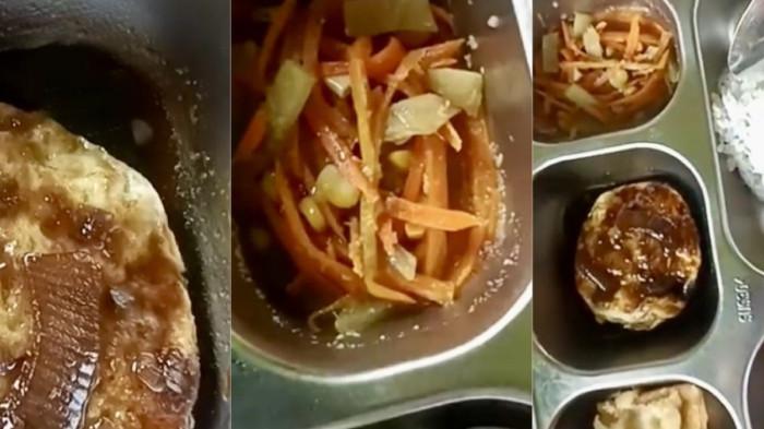 Dalam video, perekam terlihat menunjukkan larva-larva ulat yang berada di tepian celak ompreng pada lauk telur ceplok dan sayur.