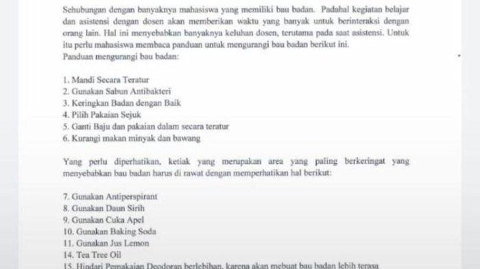 Surat yang dikeluarkan Kamis (17/11/2022) tersebut juga berisi panduan kepada mahasiwa untuk mengurangi bau badan.