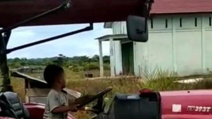 Bocah laki-laki yang diperkirakan masih berusia 3 tahun lebih itu tampak mahir mengendarai traktor sawah.
