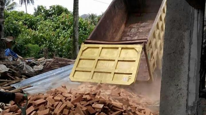 Dalam postingannya Disman Duma, mengupload foto mobil truk yang sedang menurunkan batu bata seperti menurunkan pasir yang diturunkan sekaligus.
