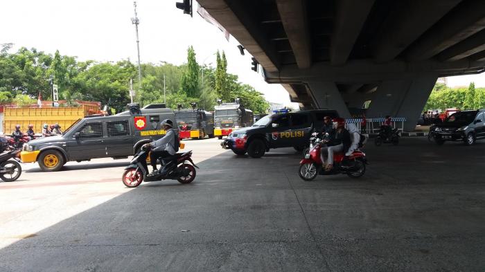 Beberapa mobil dan motor patroli juga telah disiagakan di depan Pos Lantas.