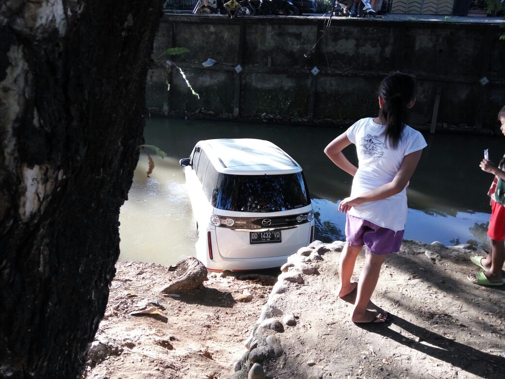 Mobil mewah Mazda Biante jatuh di kanal di Jl Abd Dg Sirua, Makassar, Senin (4/7/2016).