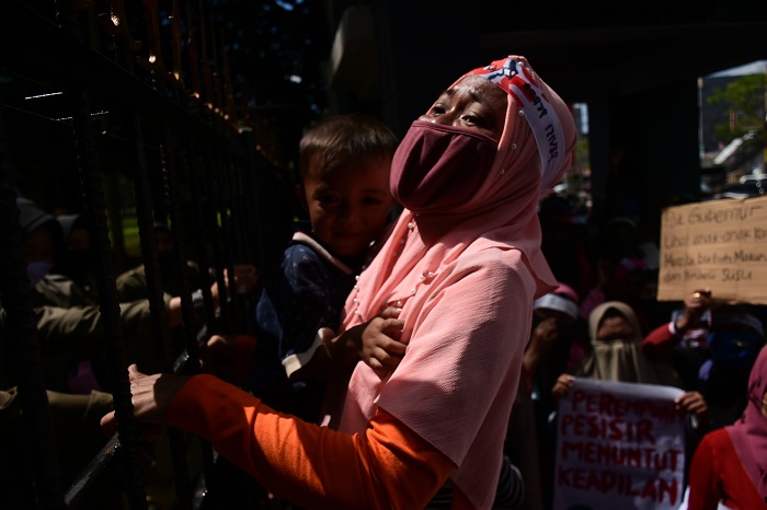 FOTO: Tolak Tambang Pasir, Istri Nelayan Pulau Sangkarrang Unjuk Rasa di Kantor Gubernur