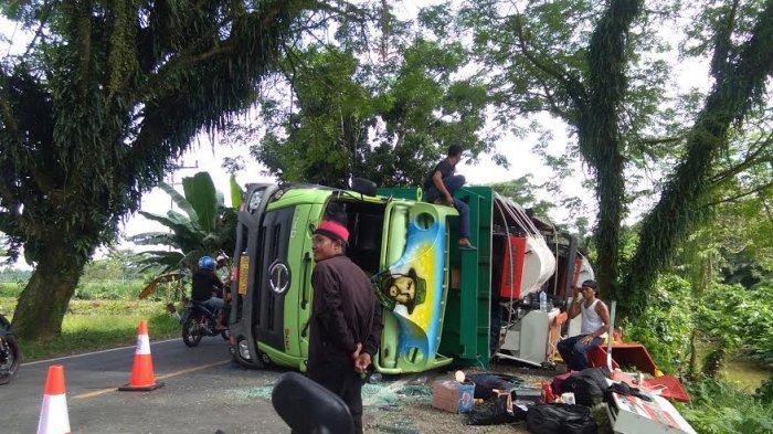Truk pemuat mesin pemanen padi terbalik di Kabupaten Luwu Utara, Sulawesi Selatan, Jumat (16/4/2021).