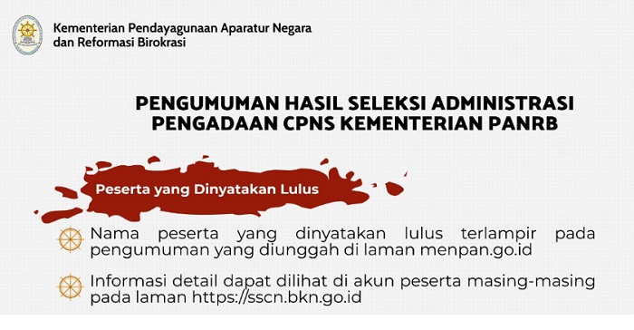Berikut ini daftar nama peserta yang lulus seleksi Administrasi Calon Pegawai Negeri Sipil atau CPNS 2019 untuk Kementerian Pendayagunaan Aparatur Neg