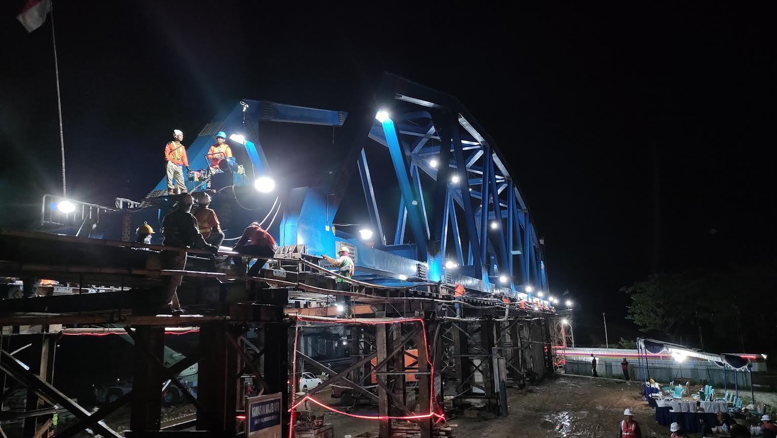 Proses Pergeseran Jembatan Rel Kereta Api dilakukan pekerja menggunakan dua pasang Hidrolik Launcher dengan kekuatan beban 250 ton.