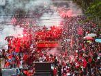 Ribuan suporter PSM Makassar memenuhi jalanan Kota Makassar untuk merayakan gelar juara Liga 1