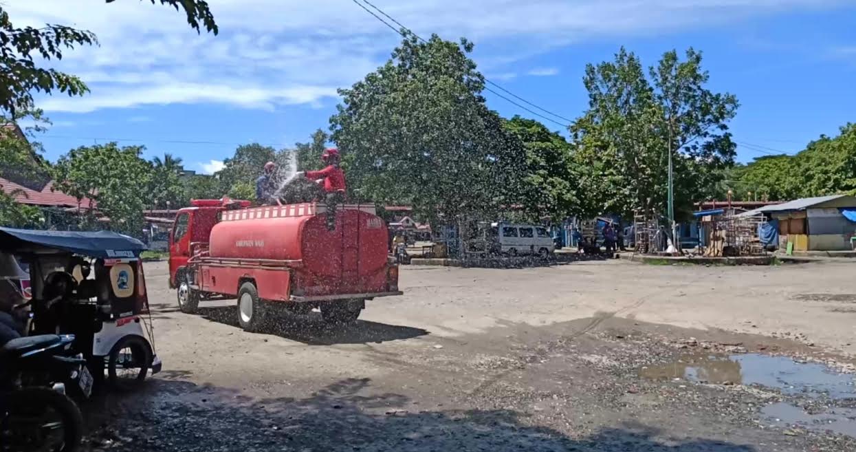Terminal Callaccu Sengkang, serta empat ruas jalan yang mengelilingi disemprot menggunakan mobil Pemadam Kebakaran, Senin (23/3/2020).