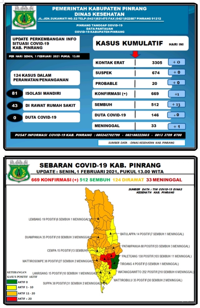Update Covid-19 Kabupaten Pinrang Hari Ini 7 Januari 2021, 2 Orang Positif dan 4 Sembuh.