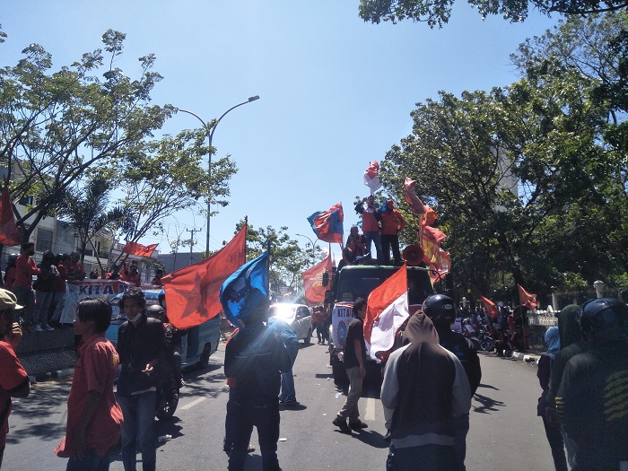 Gabungan buruh di Kota Makassar melakukan aksi unjuk rasa di depan Kantor Gubernur Sulsel, Jl Urip Sumoharjo Makassar