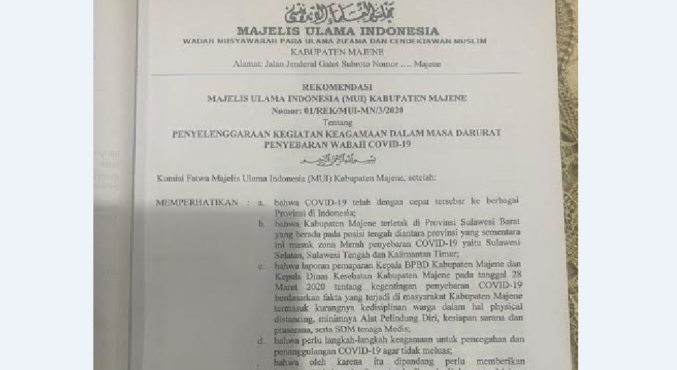 MUI Majene mengeluarkan rekomendasi terkait penyelenggaraan kegiatan keagamaan selama masa darurat Covid-19.